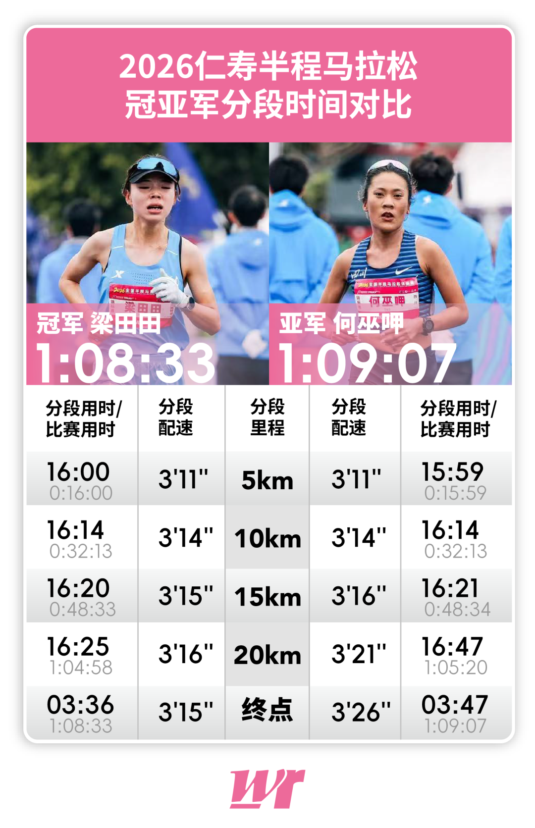 今天,刺激到张德顺的就要属梁田田和何巫呷这两位对冠军发起冲击的人选了。毕竟,作为国内半马成绩TOP3选手,她们紧随张德顺半马成绩之后。去年时,俩人在仁寿就有过一番交战,那时何巫呷以25秒的优势战胜梁田田。